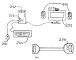 FIG. 2 depicts themuscle training machine206 coupled with adesktop home computer202. Computer runs an exercise game, that can established link with thetraining machine206 throughbluetooth adapter203. Exercise game takes extra input fromkeyboard204 andmouse201 and provide audio communication to the user throughspeakers208 and video communication throughmonitor205. Further, exercise software incorporates the pose tracking subsystem based on open source ARToolKitPlus. The pose tracking subsystem relies onweb camera207 for the video input.