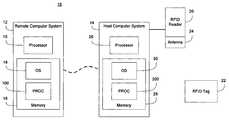 Thehost computer system14 is linked to an RFID reader20 (also referred to as a read/write device or interrogator). Thesystem10 also includes an RFID tag22 (also referred to as a transponder). RFID incorporates the use of electromagnetic or electrostatic coupling in the radio frequency (RF) portion of the electromagnetic spectrum to uniquely identify an object, animal, or person. An advantage of RFID is that it does not require direct contact or line-of-sight scanning. Another advantage is RFID, unlike bar codes, is hard to counterfeit.
