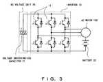 Furthermore,FIG. 3 is a configuration diagram of an electric power system noted in a later described reference patent document 1. The electric power system is configured to connect abattery32 between a neutral point of a coil of theAC motor100 and either of the negative or positive pole (i.e., the negative pole in the configuration ofFIG. 3) of theDC voltage unit20.