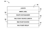 BGP encoding60 encodes the NLRI into alength field62, aMPLS label field63, a route distinguisher (RD)field64, a multicastsource length field65, amulticast source field66, and amulticast group field67.Length field62 comprises two octets andRD field64 comprises eight octets. The remaining fields withinBGP encoding60 comprise variable field lengths.