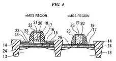 Anelement isolation portion14 having a depth of 200-350 nm is formed on an n-type silicon substrate13. An n-type well region (not shown) as a pMOSFET forming region (hereinafter referred to as simply “a pMOS region”) and a p-type well region (not shown) as an nMOSFET forming region (hereinafter referred to as simply “an nMOS region”) are formed in the active element portion that is a region divided by theelement isolation portions14. A typical ion implantation condition for forming the well region is about 500 keV of acceleration voltage and 3×1013cm−2of dosage for an n-type well into which a P ion is implanted, and about 260 keV of acceleration voltage and 2×1012cm−3of dosage for a p-type well into which a B ion is implanted.
