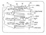 Referring now toFIG. 6, a schematic enlargement of an ion selective fiber ofFIG. 3 is provided.FIG. 6 provides a schematic illustration of molecule movement and entrapment within the ion-selective urease-immobilized fiber, generally indicated at70. The illustrated fiber/fabric70 may be provided within the dialysate regeneration fabric ofregeneration chamber14 ofFIGS. 1 and 2.