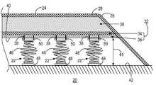 FIG. 1 shows a partial top view of aspring floor system20 in accordance with an embodiment of the invention.Spring floor system20 includes a plurality of cushioning devices22 (shown in ghost form) underlying atop side24 offloor system20. Aconventional border26 surroundstop side24.Spring floor system20 may be an apparatus for floor exercise in gymnastics. However,floor system20 may also be used for other athletic and dance activities, for both training and competitive purposes. In addition,cushioning devices22 may be incorporated into various flat surfaces for providing a cushioning and rebounding effect, such as in vault boards, springboards, portable floors, walls, crash mats, and the like.