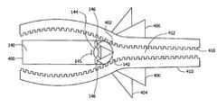 Reference is now made toFIG. 5, which presents a schematic illustration of an in vivo imaging device which may be used to view lumens such as the gastrointestinal tract, according to an embodiment of the present invention.Endoscope400 may image lumens in an unmodified environment, but modification may be used as well.Endoscope400 includes an invivo imaging device140 and may be capable of being inserted and moved through for example the intestine; other lumens may be imaged. The invivo imaging device140 may be a subsection, portion, or attachment within or ondevice400, and may share a structure and operation with, for example,device40 above, butoverall device400 may have a structure and use similar to an endoscope. The dome or convex shapedtip402 ofendoscope400 may include anoptical window142 through which the intestine is illuminated and viewed and/or imaged.Tip402 or a portion thereof, such aswindow142, may be substantially transparent, and may present a forward projecting convex portion.Optical window142 may be similar tooptical window54, described above; however, other suitable optical windows or domes may be used. One ormore illumination sources146, animager145 and alens144 may be positioned behindoptical window142.