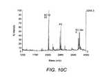 FIG. 10 shows a separation of neutral and acidic glycans using GlycoClean H cartridge. (a) The original mix of standards is shown in positive mode. A3 and SC1840 are additional highly charged, and do not ionize well. (b) Neutral glycans eluted off the GlycoH cartridge ionize well in positive mode, while only the charged sugars are present in (c), allowing them to be observed in negative mode. The multiple peaks in (c) arise from sodium adducts, typically one adduct per sialic acid residue.