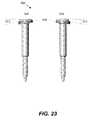 Referring toFIG. 21,facet screw300 includes anelongated body302 having aflat head306 at one end and a threadedportion304 at the opposite end. Awasher308 is fitter aroundhead306.Washer308 is configured to pivot around thehead306 at anangle313, as shown inFIG. 23 and hasteeth312 in the bottom surface for holding into the bone, shown inFIG. 22. In one example,facet screw300 has alength301 of about 40 millimeters, anon-threaded portion length303 of 20 millimeters, awidth309 of the head of about 9 millimeters, abody width311 of 4.5 millimeters, a washer width of 2 millimeters and awasher pivoting angle313 of 7.5 degrees.Facet screw300 is manufacture by SpineFrontier, Inc (Beverly, Mass.) and may be made of metal such as stainless steel or titanium, plastic, bioabsorbable material or ceramic.