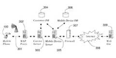 TheWAP Proxy302 passes the request for content from theMobile Phone100 to aCarrier Server303, which is used by carriers to check user accounts, log user activity, and allow or disallow access to the Internet. TheCarrier server303 relies on aCustomer Database304 for information related to these activities. TheCustomer Database304 contains customer account information such as names, telephone numbers, addresses, and profiles among others. This information can be in any known database format. In some implementations, proprietary carrier architectures tied into proprietary billing systems can be implemented to process and store billing and customer records.