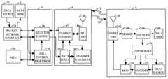 The exemplary block diagram of the data channel architecture as shown inFIG. 6 is one of numerous architectures which support data encoding and modulation on the reverse link. For high rate data transmission, an architecture similar to that of the forward link utilizing multiple orthogonal channels can also be used. Other architectures, such as the architecture for the reverse link traffic channel in the CDMA system which conforms to the IS-95 standard, can also be contemplated and are within the scope of the present invention.
