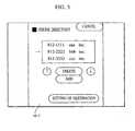 Upon the phone directory key being depressed, the phone directory used at that time is displayed in thearea40, as shown inFIG. 5, regardless of whether the individual setting is executed or not. Since phone directory data is displayed in pairs of the phone numbers of the FAX destinations and the destination names, the FAX destination can be set by depressing one of upward and downward headed arrows to scroll the phone directory setting screen40-2, selecting the desired phone number, and depressing a destination set key. Data of part of the phone directory can be deleted by depressing one of the upward and downward headed arrows, selecting the data to be deleted, and depressing a delete key. When adding data to the phone directory, a similar enter screen as shown inFIG. 4 is displayed upon an add key being depressed. A desired pair of the phone number of the FAX destination and the destination name is entered on the displayed screen. The phone directory setting screen40-2 can be canceled by depressing a cancel key.