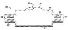 Referring now toFIGS. 3A-3C, a cross-sectional view of one embodiment ofstatus indicator20 in accordance with aspects of the invention is illustrated. The status indicator includes ahousing31, aninlet port32, acavity33, and anoutput port34. Anopening35 permits the patient, nurse, or other clinician to determine the status of fluid flow through the status indictor device. In the opening, aflexible membrane36 may be disposed to move in the indicator device in accordance with fluid pressure in the housing. In addition, a piece of material acting as a position indicator37 (e.g. a plastic indicator) may be coupled to the membrane to provide easy visual feedback of the flow status.Position indicator37 may be configured to provide visual or tactile cues of the flow status, for instance.