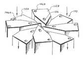Each of theblades112A,112B in the blade array may be coupled to aninner hub mechanism122. Theinner hub mechanism122 shown in the figures includes afirst hub124A and a second hub (hidden). As shown inFIG. 4C, each of theblades112A,112B may have a pair of inner elongated slots126 (only one of the pairs of slots is visible in the figures). Eachslot126 has a cylindrical configuration with a cross-section that is radially elongated. Theinner slots126 are arranged in circular patterns about the central axis A. Thefirst hub124A and the second hub (hidden) of theinner hub mechanism122 may each have a plurality of cylindrical bores128 (only one of the pluralities of bores is visible in the figures). Inner pins130 (only one of the pairs of pins is visible in the figures) couple theblades112A,112B to theinner hub mechanism122 viaslots126 andcorresponding bores128. Thepins130 may be friction fitted with thebores128 and are configured to move radially and axially within theslots126.