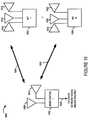 Exemplary transmission will be described. The Rx/Tx switches (911,921,931) have been commanded in the Tx mode position. Transmitdata stream1953 is input totransmitter module1910.Transmitter module1910 includes anencoder917 and amodulator915. Theencoder917, e.g., an LDPC encoder, converts information bits ofdata stream1953 into coded bits which are input to modulator915 which generates a modulated signal to convey the codes bits. The output signal fromtransmitter module1910 is fed to thesecond antenna904 via the Tx/Rx switch921, for transmission. The output signal from thetransmitter module1910 is also fed to phaseshifter905, which performs a phase shift operation wherein the amount of phase shift is a function of the polarization direction difference between the first and second antennas (902,904). The output of thephase shifter905 is fed to thefirst antenna902, via Tx/Rx switch911 for transmission.