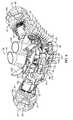Therack50 drives acompound pinion gear54 pivotably connected to the lateral sides of thechassis12. Thecompound pinion gear54 drives alink spur gear55 each of which is connected to one of a pair of linkages (FIG. 6) disposed on each lateral side of thetoy vehicle10. The linkages include adrive rod56aactuating a pivotably mountedlever56b. Opposing ends of thedrive rod56aare pivotably connected with an eccentric pin on thelink spur gear55 and a proximal end of thelever56b. The free ends of the linkage levers56bare connected to the face shield48 (FIGS. 1 and 2) to raise and lower theface shield48.