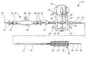 Theintroducer catheter12 includes an elongateinner stent carrier22 and an elongateouter sheath24. Theouter sheath24 is slidably disposed about theinner stent carrier22 in a coaxial arrangement. As best seen inFIG. 3, thestent20 is circumferentially mounted on adistal end portion26 of theinner stent carrier22. Thedistal end portion26 includes astent carrying portion28 having a reduced diameter configured to receive the self-expandingstent20. More specifically, thestent carrying portion28 has an outside diameter smaller than the outside diameter of the adjacent or other portions of theinner stent carrier22 so that when thestent20 is loaded onto thestent carrying portion28, the resulting thickness or diameter of thestent20 andstent carrying portion28 is not greater than the diameter of the adjacent portions of theinner stent carrier22. The length of thestent carrying portion28 approximates the length of thestent20.