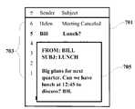 One exemplary implementation of the present invention is illustrated inFIG. 6. As shown, adisplay screen601 shows alisting603 of “Inbox” messages. When the first message to “Helen” is highlighted by the user, a pop-up “content”window605 is automatically displayed overlying the displayedlisting603. The content window is designed to display the content of the message highlighted without requiring the user to navigate and scroll as hereinbefore discussed. The content window determines where the content of the message begins by finding an appropriate content field markers in the message display data. As illustrated, in the example, the first five lines of the message content are displayed in the pop-up content window along with the “From” and “Subject” fields. This enables the user to ascertain the message content quickly and navigate through the entire listing of messages in the same way to quickly find a selected message or a particular message for example which will have an answer to a posed question, without having to go through the details of all of the messages in the user's inbox listing. If the message cannot be completely displayed in the message box, then the user is provided by an option to scroll the message until the end of the message.