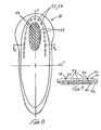 Therefore, one criteria forfunctional enhancement indicator34 is that it clearly identify one portion, such as one end portion, of the article as being functionally different from other portions by a visual signal distinct from the overall shape of the article about its periphery, which shape may, in fact, provide the user with an opposite intuitive response. One way of describing an asymmetric article of the present invention, therefore, is the article has two end portions each differing from the other in maximum width measured parallel to a transverse centerline, and differing in surface area measured with respect to the periphery and the transverse centerline, but which article comprises a visually-perceptible signal to the wearer, the visually-perceptible signal distinctly identifying one end portion of the article as being a region of particular significance, for example, as the region of intended fluid entry. The perception of the user may be that the indicated portion of the pad may be one of greater absorbency, greater fluid containment capacity, less leakage, better dryness, better odor control, improved softness, or other signals that facilitate an intuitive response to orient the functional enhancement indicator properly, e.g., to the front of the undergarment.