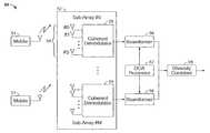 A single DOA estimation and beamforming processor is shared between all sub-arrays. DOAs of the received signal's dominant path (and possibly other secondary multipath components) are assigned to sub-arrays to enable computation and update of their respective weight vectors. Also, the same weight vector may be used for more than one sub-array if secondary paths are unused (or for economy of implementation). Let wb(m)(p)εCsdenote the pth bin's beamforming vector for the mth sub-array. The mth sub-array output is given by