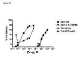 FIG. 10 shows that tacrolimus blocks the anti-proliferative activity of zotarolimus in smooth muscle cells in vitro (FIG. 10A). The anti-proliferative activity of zotarolimus, paclitaxel (P) and combinations in smooth muscle cells (FIG. 10B) and endothelial cells (FIG. 10C) in vitro are also shown. Proliferation was determined by measuring; data are the mean±SEM of 3 experiments, except as noted.FIGS. 10D-G show isobologram analyses of combination anti-proliferative activity in smooth muscle cells. The concentrations producing the specified level of anti-proliferative activity were determined from the dose-response curves generated by non-linear curve fitting of the data means.FIGS. 10H-K show isobologram analyses of the anti-proliferative activity of the combination of zotarolimus and paclitaxel in endothelial cells. The concentrations of compounds producing the specified levels of activity were determined from the mean data.FIGS. 10L-M shows a combination index (CI) analysis of the antiproliferative activity of combinations of ABT-578 and paclitaxel in hCaSMC and hCaEC. CI levels were determined from the mean data using the method of Chou and Talalay (Chou and Talalay, 1984).