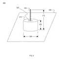 FIG. 3 is a simplifiedschematic illustration300 of an embodiment of an X, Ku, K-band omnidirectional antenna with dielectric loading.Conductor305 has alength310 of 0.387 inch and a diameter of 0.050 inch.Dielectric resonator315 has anouter diameter320 of 0.290 inch andinner diameter325 of 0.102 inch. Itsheight330 is 0.151 inch.Dielectric resonator315 embodiments are made of aluminum oxide Al2O3, but other dielectrics may be used.Dielectric resonator315 provides loading to the antenna system.Ground plane335 can incorporate a backside 50 ohm coaxial feed (not shown). In embodiments, feedpoint is flush withgroundplane335.Ground plane335 can be greater than or equal to approximately the wavelength of the antenna's lowest frequency.Ground plane335 can be of varied shape. Nonlimiting examples include a circle or rectilinear shape. Size can include an approximate six inch diameter, smaller or larger depending on application requirements. Materials can include copper, brass, and aluminum.Dielectric resonator315 of the antenna is located onground plane335, with no separation. Embodiments include a four-hole flange subminiature A (SMA) connector and a 99.5 percentalumina dielectric toroid315 with rectangular cross section and relative dielectric constant ∈rof 9.7. Scaling dimensions larger results in performance at lower frequencies.