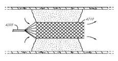 Referring now toFIG. 62, adelivery tube6215 deploys a tethered expandable scaffold6210 (e.g., cage-like device, stent-like device such as, but not limited to,expandable scaffold610,expandable scaffold810, expandable scaffold910) prior to insertion of the coil(s) (or other filler), using a standard over-the-wire (OTW) system including guide-wire6220. The tetheredexpandable scaffold6210 can include the structure or features of any of the expandable scaffolds described herein. Thedelivery tube6215 and the tetheredexpandable scaffold6210 can together form an expandable tip assembly (such as but not limited to expandable tip assembly510, expandable tip assembly610). Thedelivery tube6215 and the tetheredexpandable scaffold6210 can comprise a vessel reconstruction system that is able to be deployed prior to filling, be used to reconstruct the arterial wall at the aneurysm neck, hold filler in place, and then is able to be removed after filling of the aneurysm sac is complete.