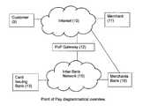 ThePoP gateway12 is connected to both theInternet10 and theinter-bank network15 and is involved in both the initial EFTPOS transaction that is used to confirm the identity and funds of the customer9, and the standard authorisation/funds transfer messages that are sent from themerchant11 via the merchant's AcquiringBank16. Multiple payment gateways may exist at any one time to prevent congestion or possible attacks, such as a ‘denial of service’ attack, from rendering the system inoperable. It is also possible that any arbitrary PoP device may be required to connect to a specific PoP gateway due to the geographical location or contractual arrangements of said PoP device. Additionally, the PoP gateway need not be a physically separate entity, but may in fact be integrated into the inter bank network or deployed and maintained by thecard Issuing bank13 as a part of its financial host system.