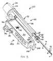 As shown inFIG. 21, the distal end (500) of holster (302) may be modified to accommodate probe (102). In particular, the distal end (500) of holster may include a set of rigid locking teeth (504) that are configured to engage teeth of gear (74) upon coupling of probe (102) with holster (302). Teeth (504) may be integrally formed with top housing member (304). For instance, in some versions, top housing member (304) comprises a molded plastic, and teeth (504) are molded as a unitary part of top housing member (304) (e.g., such that teeth (504) and the remainder of top housing member (304) form a homogenous continuum of material). Of course, teeth (504) may be provided in a variety of other ways. By way of example only, teeth (504) may be part of an adapter (not shown) that is configured to selectively engage distal end (500) of holster (302) (e.g., by snapping on, by clamping on, etc.). In some such variations, holster (302) may be configured to accept probe (103) in the absence of the adapter; while being configured to accept probe (102) when the adapter is coupled with holster (302). Still other ways in which teeth (504) may be provided will be apparent to those of ordinary skill in the art in view of the teachings herein. It will also be appreciated that any other suitable structures or devices may be used in addition to or in lieu of teeth (504), as desired.