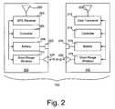 FIG. 2 is a block diagram showing separatedtracking device102 in greater detail to include afirst portion200 physically spaced apart from asecond portion202.First portion200 includes aGPS receiver204, acontroller206, abattery208, and a short-range wireless device210.Second portion202 includes adata transceiver212, acontroller214, abattery216, and a short-range wireless device218.