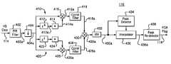 Multiplier416 multiplies the resulting conjugated, delayedsignal414awith another copy ofdownsampled signal404ato generate complex correlation signal416a.Correlation filter418 filters correlation signal416ato generate filtered correlation signal418a.Correlation filter418 is discussed further below in conjunction withFIGS. 6 and 7.