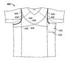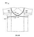 From the left armpit or axillary region of theshirt400, thechannel406 proceeds along the upper back of theshirt400 into the region of a wearer's right scapula or shoulder blade, drapes over the right shoulder of theshirt400, and loops under the right armpit or axillary region of theshirt400. From the right armpit or axillary region of theshirt400, thechannel406 proceeds along the upper back of theshirt400 into the region of a wearer's left scapula or shoulder blade, drapes over the left shoulder of theshirt400, and returns to the left armpit or axillary region of theshirt400. Numerous different techniques may be employed to weave thechannel406 into theshirt400. For example, one or more pieces of fabric (or other material), may be sewn (or otherwise fastened or adhered) onto a surface of theshirt400 to form thechannel406 between the supplemental fabric and the fabric of theshirt400. In order to best conceal thechannel406, it may be desirable to form thechannel406 on the interior surface of theshirt400.
