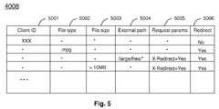Column5001 contains the ID of theclient1000 which sends the request. For example, the ID can be the IP address of the client computer. If application programs in a client computer do not support HTTP redirection, the IP address of the client can be specified in this column with a “No” entry incolumn5006 so that a redirection response is not returned to the client computer.Column5002 contains the type of the requested file. The type can be determined, for example, by referring to the extension of file name.Column5003 contains the condition regarding the size of the requested file.Column5004 contains the condition regarding the path of the requested file. For example, “/large/files/” matches any file stored in a directory named /large/files or one of its subdirectories.Column5005 contains the condition regarding one or more request parameters which are specified in HTTP request header sent from the client. For example, “X-Redirect=Yes” matches any request with a header field named “X-Redirect” and its value “Yes.” This column can also be used to classify clients which support redirection. An entry of “*” recorded in any of columns5001-5005 means no condition is defined, i.e., any request satisfies the condition. If a request satisfies all of conditions recorded in columns5001-5005 in a single row, the policy recorded incolumn5006 is applied to the request. A “Yes” entry incolumn5006 means the request should be redirected. A “No” entry means it should not.