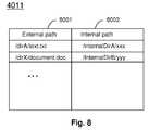 FIG. 8 illustrates an exemplary path table4011 in thestorage node1004 ofFIG. 4. It contains information regarding the mapping between an external file path incolumn8001 and an internal file path incolumn8002 for each file stored in anode1004. For example, as seen inFIGS. 7 and 8, a file exposed to clients as /dirA/text.txt is stored in the storage area ofnode3 as an internal file /internalDirA/xxx.