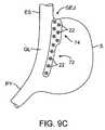 FIG. 9C shows yet another example in which a double-row of tissue anchors may be deployed along the tissue ridge adjacent to the gastroesophageal junction to alleviate pressure exerted by food or liquid when initially entering the stomach.
