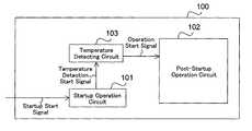 The threshold temperature (the lower limit of the operation guaranteed temperature of the post-startup operation circuit102) is set beforehand in thistemperature detecting circuit103. Thetemperature detecting circuit103 sends an operation start signal to thepost-startup operation circuit102 when the detected temperature reaches the threshold temperature.