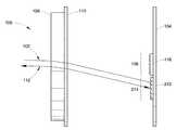 FIG. 2 illustrates a detail view oflens110 that includes acenter portion146 and anedge portion148. In this embodiment,lens110 is a Fresnel lens that collimates light emitted from a source within a short distance. In order to receive and collimate light from disparate angles,lens110 contains a plurality of concentric rings emanating from thecenter portion146 to theedge portion148. Three of these concentric rings are illustrated as aring140, aring142, and aring144. The surface angle of each section increases as its radial distance increases from thecenter146. Thus, the surface angle of thering144 is greater than the surface angle of thering142. Similarly, the surface angle of thering142 is greater than the surface angle of thering140. In this manner, light is collimated such that light from a source on one side exits thelens110 in a parallel fashion on the other side.