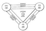 To make such devices useful for navigation, the system incorporates advanced device performance models in its software to more accurately predict the INS subsystem drift and other errors. As depicted inFIG. 1, the lower arrows represent the trajectory-based calibrations applied to theINS readout103 derived from the GPS and TPS fix data. Thus, the 3 independent trajectories are continually compared and the INS gains, drift factors, and linearities are dynamically adjusted to match the GPS (presumed best) and TPS path data sets. Either triple-input Kalman filtering, Allan-style (i.e., statistically weighted, non-linear) filtering, multidimensional kernel techniques, or combinations thereof may be employed for the real-time GPS/TPS/INS integration processing. With appropriate temporal filtering, tracking the resulting displacements is relatively straightforward, but calculating the implied orientation angles is much more complex. Besides processing the coordinate transformations and compensating for the hysteresis, random-walk drift, and other parametric nonlinearities such as axis inorthogonality and acceleration-force compensation of the INS, the system must also provide means of initially orienting the INS at startup and at reasonable intervals before substantial errors can accumulate (an otherwise inevitable result due to INS drift). From previous experience, ORNL has found that flux-gate magnetometers can yield predictable north vectors (if well separated from ferrous objects), inexpensive tilt meters or other mechanisms (such as orthogonally-deployed accelerometers) can provide the gravitational reference vector, and high-quality barometric altimeters for vertical position can serve as useful adjuncts to the INS components. Another possibility is a novel electromagnetic gyroscopic sensor, described in a basic sense in U.S. Pat. No. 6,466,200 (and others) which may prove very cost-effective for the INS unit. Still another INS implementation, covered in principle in U.S. patent application Ser. No. 10/840,092, utilizes an array of orthogonal quartz crystals as accelerometers; by using 6 units mounted in a bi-orthogonal fashion, the 3 (X, Y, Z) linear accelerations and (using the pairs as couples) the 3 rotational accelerations (roll, pitch, yaw) can also be measured. More on the operation of this system will be described later. In any event, the selection and optimization of INS components for TRI•NAV will obviously be largely dictated by the overall application's performance requirements. AS an aid to the RF systems, the integrated INS position data is used by the invention to provide holdup during the relatively rare (and limited-time) intervals when reception from both RF systems is impaired.