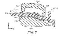 As seen inFIG. 6, deformation of thedisk210 may preferably involve deflection of the annular processing in a direction normal to the major surfaces of thedisk210, i.e., along the z-axis as depicted inFIG. 6 which can also be described as in a direction normal to the major surface of the disk.