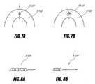 FIGS. 8A-B illustrate an embodiment of an improvedwoven tissue implant5104 that can advantageously be easily removed, from, e.g., the tongue or the soft palate. Theimplant5104 may be a batten type stiffener or tissue anchor formed from a single strand. The single strand can be woven or knitted into a desired shape, for example, a rod-like structure. Thewoven tissue implant5104 may be deployed into tissue to stiffen a particular area and serve a similar function to the implants illustrated in FIGS. 8 and 12-17 of Conrad or implants of the PILLAR® system (Restore Medical), or attached to one or more tethers for use as a tissue anchor or sling. The woven design facilitates tissue ingrowth within the spaces around the wovenimplant5014, effectively increasing the surface area of theimplant5104 and increasing the implant's anchoring force. Theimplant5104 is most preferably configured to have sufficient structural integrity necessary to anchor tissue. However, thewoven implant5104 is also preferably configured such that pulling on an end of the single strand of the implant with an appropriate force will unwind or unravel theimplant5104 into a long filament (as shown inFIG. 8B) for simple and convenient removal of the implant. The appropriate force required to unwind theimplant5104 is most preferably sufficiently greater than the tensioning force of the tissue on theimplant5104 while deployed in the tongue, palate, or surrounding tissue so that theimplant5104 does not undesirably unwind while deployed. Part or all of theimplant5104 may include a radiopaque marker material.