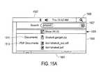 FIGS. 15A,15B,15C, and15D show an example of a system wide search input user interface and search result user interface. In one particular exemplary embodiment, these user interfaces are available on the entire system for all applications which run on the system and all files and metadata, and even address book entries within an address book program, such as a personal information manager, and calendar entries within a calendar program, and emails within an email program, etc. In one exemplary embodiment, the system begins performing the search and begins displaying the results of the search as the user types text into a text entry field, such as thetext entry field1507. The search results are organized by categories and are displayed as a short list which is intentionally abbreviated in order to present only a selected number of the most relevant (scored) matches or hits to the search query. The user can ask for the display of all the hits by selecting a command, such as the “show all”command1509.FIG. 15A shows a portion of a display controlled by a data processing system. This portion includes amenu bar1502 which has at its far end asearch menu command1505. The user can select the search menu command by positioning a cursor, using a mouse, for example, over thesearch menu command1505 and by pressing a button or by otherwise activating or selecting a command. This causes a display of atext entry region1507 into which a user can enter text. In the example shown inFIG. 15A, which is a portion of the display, the user has entered the text “shakeit” causing the display of a search result region immediately below a “show all”command region1509 which is itself immediately below thetext entry region1507. It can be seen that the hits or matches are grouped into categories (“documents” and “PDF documents”) shown bycategories1511 and1513 within thesearch result region1503.FIG. 15B shows another example of a search. In this case, a large number of hits was obtained (392 hits), only a few of which are shown in thesearch result region1503. Again, the hits are organized bycategories1511 and1513. Each category may be restricted in terms of the number of items displayed within thesearch result region1503 in order to permit the display of multiple categories at the same time within the search result region. For example, the number of hits in the documents category may greatly exceed the available display space within thesearch result region1503, but the hits for this category are limited to a predetermined or dynamically determinable number of entries within thesearch result region1503 for thecategory1511. An additional category, “top hit” is selected based on a scoring or relevancy using techniques which are known in the art. The user may select the “show all”command1509 causing the display of a window, such aswindow1601 shown inFIG. 16A.FIG. 15C shows a display of a graphical user interface of one embodiment of the invention which includes themenu bar1502 and thesearch menu command1505 on themenu bar1502.FIG. 15D shows another example of thesearch result region1503 which appeared after a search of the term “safari” was entered into thetext entry region1507. It can be seen from thesearch result region1503 ofFIG. 15D that the search results are again grouped into categories. Anothersearch result window1520 is also shown in the user interface ofFIG. 15D. It can be seen that application programs are retrieved as part of the search results, and a user may launch any one of these application programs by selecting it from the search result region, thereby causing the program to be launched.