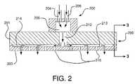 Further details on anabsorptive plate200 are shown inFIGS. 2 and 3. Referring toFIG. 2, anabsorptive plate200 incorporating gas distribution outlets to distribute gas evenly over a substrate to allow rapid and controlled heating and cooling of the substrate is shown. Theplate200 includes atop portion201 having agas introduction system202, includes a firstgas introduction port204 and an optional secondgas introduction port206 in communication with agas mixing chamber208 for mixing gases the two gases. If only a single gas introduction port is provided, mixingchamber208 can be eliminated from the design. It will be understood that additional gas introduction ports can be provided as well. Thegas introduction ports202,204 would of course be connected to a suitable gas source such as a tank of gas or gas supply system (not shown). Mixingchamber208 is in communication withgas flow passage212, which is in communication withgas channel214 andgas introduction openings216 formed inblocker plate213. Theblocker plate213 may be a separate component fastened to thetop portion201, or it may be integrally formed with the top portion. Of course, other designs are possible, including ones where two or more sets of individual openings of thetype216 are provided for two or more gases so that gas mixing takes place after exiting the showerhead. The absorptive plate includes aface203 through whichopenings216 are formed.