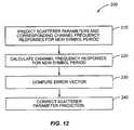 When considering the operation of algorithms such as the above over an extended time period, various modes of operation may be employed. For example, the above methods could be used on a block-by-block basis, e.g., by processing a block of previous OFDM symbol waveform samples jointly with the signal samples for the current OFDM symbol to determine a set of scatteringobjects10 pertinent to that block. However, if it is not desired to increase latency in processing the current symbol, then each OFDM symbol would need to be processed along with previous symbols, resulting in previous symbol data being reprocessed multiple times. There is at least one advantage of such a method, namely that older symbols reprocessed with the current symbol waveform samples may now have been error-correction decoded and thus data as well as pilot symbols can be used to estimate the older symbols' frequency responses. Including already-decoded data will also be considered with the continuous tracking algorithms described below.