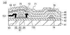 Other wiring, such as a gate wiring film and a source wiring film, and other electrical components are arranged at positions spaced apart fromTFT60 on the surface of thetransparent substrate41 of theTFT panel40. Here, thegate wiring film74 is illustrated.