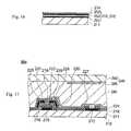 Reference numerals221 and222 inFIG. 15(b) indicate a source electrode and a drain electrode that are formed with portions of theconductor223 that remain on both sides of thegate electrode215.