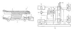 The patient couch1 is initially in mobile operation, i.e. in the undocked state. Pressing on the foot pedal4 (see alsoFIG. 1) actuates thepiston pump11. This causes hydraulic oil to be pumped out of ahydraulic oil container14 by way of acontrol valve13A into alifting cylinder19, which is extended as a result, thereby raising the patient support plate3 (seeFIG. 1). Conversely pressing on thefoot pedal5 actuates thepiston pump12, with the result that hydraulic oil flows by way of a hydraulicallycontrollable control valve13B out of the liftingcylinder19 into thehydraulic oil container14 and thepatient support plate3 is lowered.