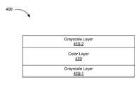 As yet another example, grayscale parameters defined in one or more grayscale layers410 may also be preserved. For example, transparency parameter values for grayscale assets may be maintained. As mentioned above,color layer420 is separate from grayscale layers410, and parameters defined in the grayscale layers410 may remain unchanged by a shift or other change to one or more parameters incolor layer420. This may help preserve certain design principles and/or features included in a GUI. Moreover, a designer of the GUI may design one or more grayscale layers410 in a way that may skew parameters ofcolor layer420 toward desired design principles in the GUI.