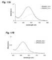 Various figures support one or more characteristics of the fluorescing chemical probes200 of class B, including, for example,JPW 6003 andJPW 6033.FIG. 17 illustrates the Dye absorbances in ethanol (FIG. 17A) and multilamellar lipid vesicles (FIG. 17B).FIG. 18 depicts dye emission spectra in ethanol (FIG. 18A), and multilamellar lipid vesicles (FIG. 18B).FIG. 19 depicts the wavelength dependent relative transmitted light (FIG. 19A) and fluorescence (FIG. 19B) responses on the hemispherical lipid bilayer (HLB) for 100 mV voltage steps. InFIG. 19B, the fluorescence emission was collected through a >715 nm cutoff filter.