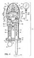 - 10. resets for inflation by clearing CO2and/or air from the four-port infusion “Y”44 and appropriate connected tubes, passages and the like by depressing the evacuation controlvalve actuator button62 to open theevacuation control valve60, thereby automatically releasing the pressurized gas in the four-port infusion “Y”44 and appropriate connected tubes, passages and the like, followed by full inward actuation of theplunger30 of theevacuation syringe28 to cause theplunger stop34 to impinge thesyringe support bracket70 of thelower housing half18 and a corresponding like area on theupper housing half16 to depressurize and to expel CO2and/or air through the Luer connectorpurge check valve130. This resets the vacuum potential of theevacuation syringe28.