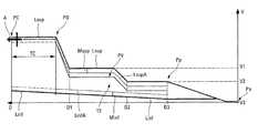 - by a fine continuous line, the auxiliary lower limit LinfA which is defined solely on said distant stretch TE, on the basis of said lower limit Linf to which said speed margin Minf has been added. A dashed line shows that the limit LinfA is not taken into account on the current stretch TC.