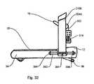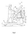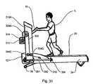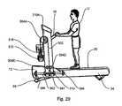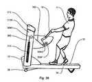 Treadmill10 utilizes a known microprocessor (not shown) or other suitable electronic controller to control and operate the various features of the invention. For example, the speed ofbelt20, can be controlled by the microprocessor or other suitable electronic controller. The speed is adjustable from controls on pushing and pullingmeans16 orconsole212 making it possible to vary the speed ofbelt20 during the exercise regimen. Further, the inclination ofbelt20 also can be controlled by the microprocessor or other suitable electronic controller. For example, the inclination of thebase12, and thus thetreadmill10 can be illustrated by a simple incline mechanism in which alever leg36 is rotated by an incline motor to raise andlower base12. Actuation of the incline motor causes the rotation oflever leg36 in the desired direction, thus raising or lowering base21 andbelt platform34, thus causing the decline or incline, respectively, ofbelt platform34. The degree of inclination chosen by user U is adjustable from controls on pushing and pullingmeans16 orconsole212 making it possible to vary the inclination ofbelt20 during the exercise regimen.