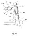 FIG. 25 is a side view, partly in section, of an alternatepneumatic resistance mechanism400 in the resting position. In this embodiment,resistance mechanism400 is a pneumatic mechanism comprisingpneumatic cylinder402,air compressor404, and various connectinghoses406. In known pneumatic mechanisms, the resistance ofpneumatic cylinder402 can be set to certain values corresponding to a known resistance by the setting of compressor404 (the higher the pressure of the compressed air produced bycompressor404, the higher the resistance ofpneumatic cylinder402, and the higher the equivalent resistance). Similarly, the resistance mechanism can be a hydraulic cylinder and the air a fluid.Pneumatic cylinder402 is attached to the frame of the device andcylinder rod408 is attached torod pulley410. Pushing on pushinghandles16 ultimately, via cabling and pulleys as disclosed previously, pushescylinder rod408 intopneumatic cylinder402, with the air withinpneumatic cylinder402 providing resistance. The use of apneumatic cylinder402 with known or adjustable resistance is known and can be used to provide a basis for determining the simulated resistance (weight) being pushed by user U.FIG. 26 is a side view, partly in section, of the alternatepneumatic resistance mechanism400 in a resistance position.