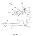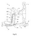 FIG. 21 is a side view of an alternate embodiment of the invention having pivotinguprights210 in the resting position in which theuprights210 andconsole212 pivot.FIG. 22 is a side view of the alternate embodiment shown inFIG. 21 in the operating position. In these views, pushing handle16 (or pushingbar16C) is rigidly attached to consolearm212A. When user U pushes on pushinghandle16, theentire console structure200 comprised of pushinghandle16,console arm212A (andconsole arm212B),console212, anduprights210 pivots forward aboutconsole pivot point390.Main cable302 is attached tolower frame34 viacable attachment310, travels upwards to and arounddirectional pulley304A, arounddirectional pulley304B and downwards to directly connect tocable attachment313 located at an end ofmoment arm314. Thus, pushing the pushing handle16 (or pushingbar16C) causes theconsole structure200 to pivot forward andcable302 to liftmoment arm314. This embodiment also allows for a direct cable connection tomoment arm314 without the need for liftingpulley308 orsecondary cable326. A liftingpulley308 andsecondary cable326 can be used if desired to step down the effect of pushingbar16C. Additionally, a separate attachment ofmain cable302 to a second pushingarm14B is unnecessary.